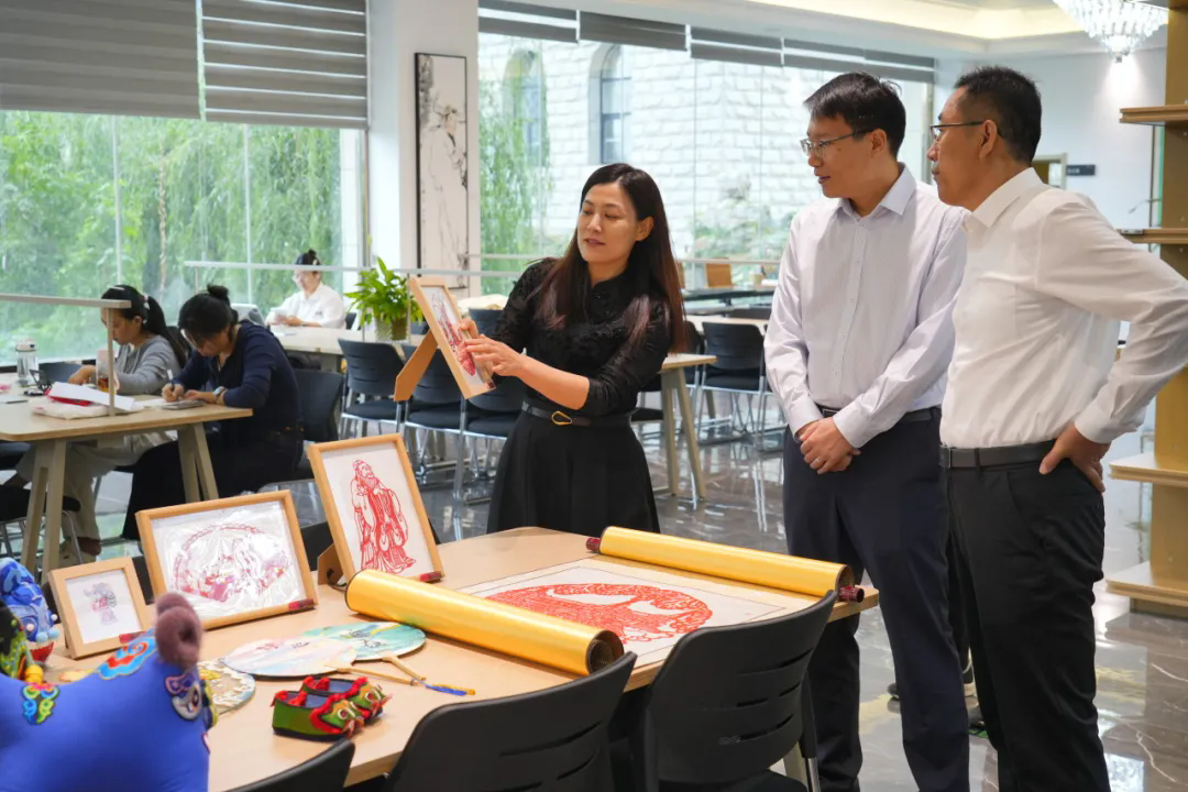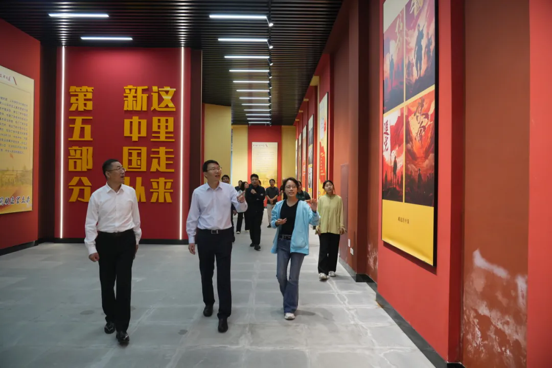 景永帅副县长、县文旅集团副总王敏、青竹画材董事长刘其通一行,沿着“艇库——鸡鸣城(民俗文化展示区)——红园(马恩雕像)——设计学院——美术馆——非遗展厅——石窟——六心牌楼——书法学院——造型学院”深入校园参观考察。在鸡鸣城,考察团感受浓郁民俗文化氛围;红园内,马恩雕像传递的精神内涵引发共鸣;图书馆、美术馆、非遗展厅、文峰塔石窟等,充分展现了学校独特的艺术建筑风格与丰富的艺术文化底蕴。